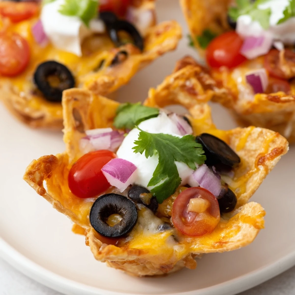 These cheesy nacho cups transform classic tortilla chips into handheld vessels loaded with two types of melted cheese, black beans, diced tomatoes, olives, and jalapeños. They bake in just 10 minutes for a warm, bubbly appetizer that's ideal for feeding a crowd during football season or casual get-togethers.