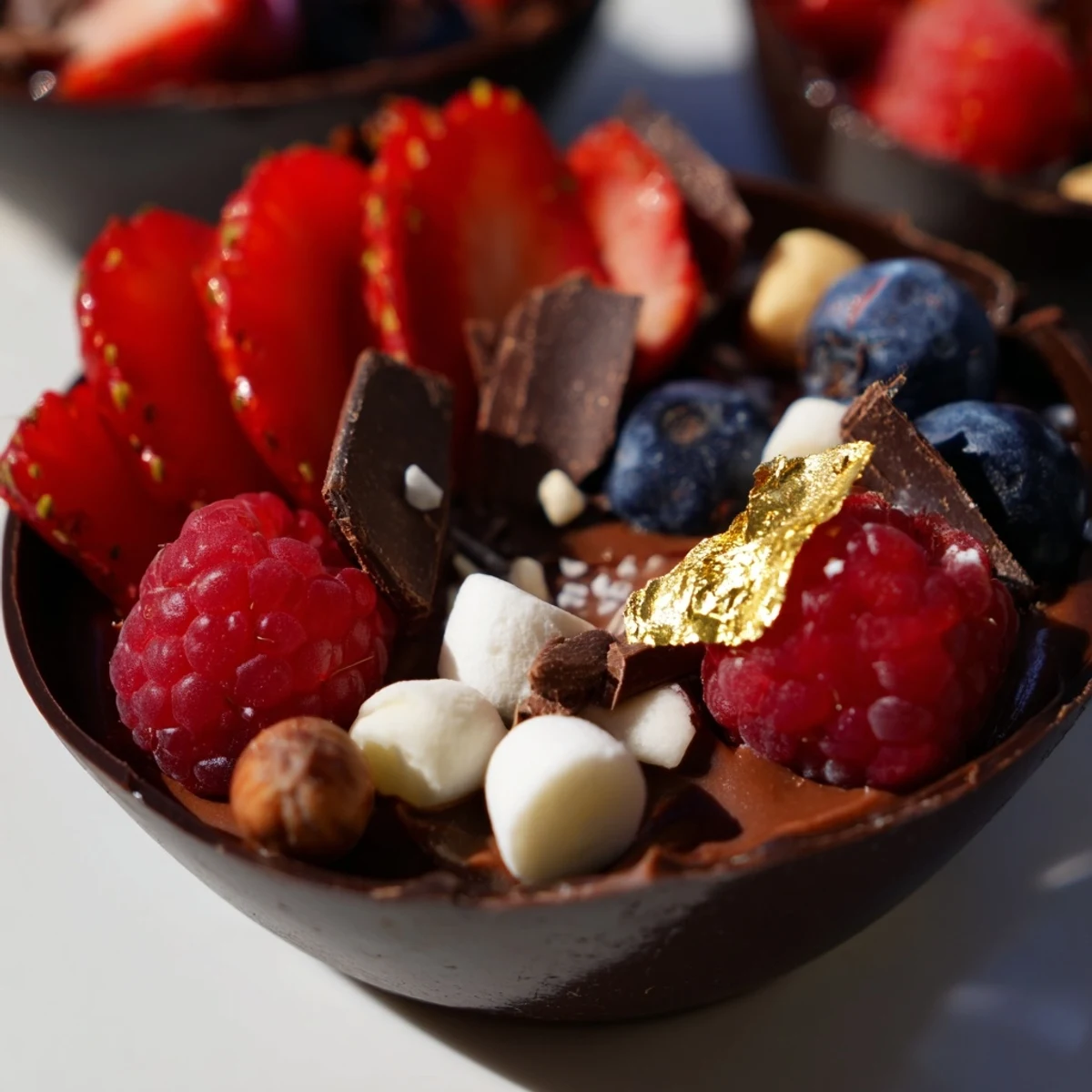 Create stunning chocolate grazing cups featuring handmade edible chocolate vessels filled with silky dark chocolate mousse. These individual desserts combine the richness of artisanal chocolate with fresh seasonal berries, crunchy nuts, and playful toppings like mini marshmallows and chocolate curls. Each cup delivers a perfect balance of textures and flavors—creamy, crisp, tart, and sweet—making them ideal for dessert tables, dinner parties, or special celebrations.