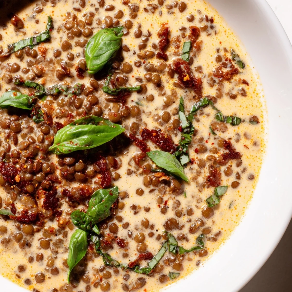 The preparation involves simmering dried lentils until perfectly tender, then building the flavorful base with sautéed onions, garlic, and chopped sun-dried tomatoes. The sauce comes together by stirring in cream and Parmesan, creating that signature silky consistency. Fresh basil brightens the final dish, adding herbal notes that complement the rich, smoky undertones.