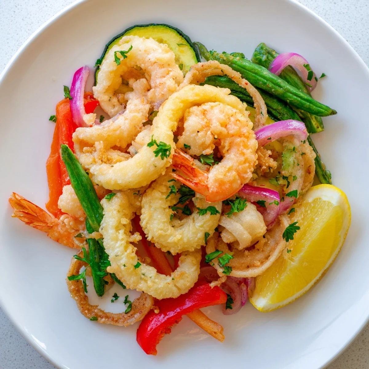Pat shrimp and vegetables dry, then dip in a light batter made from flour, cornstarch, baking powder and ice-cold sparkling water. Fry in hot oil at 180°C (350°F) in small batches for 2–3 minutes until golden and crisp. Drain on paper towels, garnish with parsley and lemon, and serve hot with aioli or marinara.