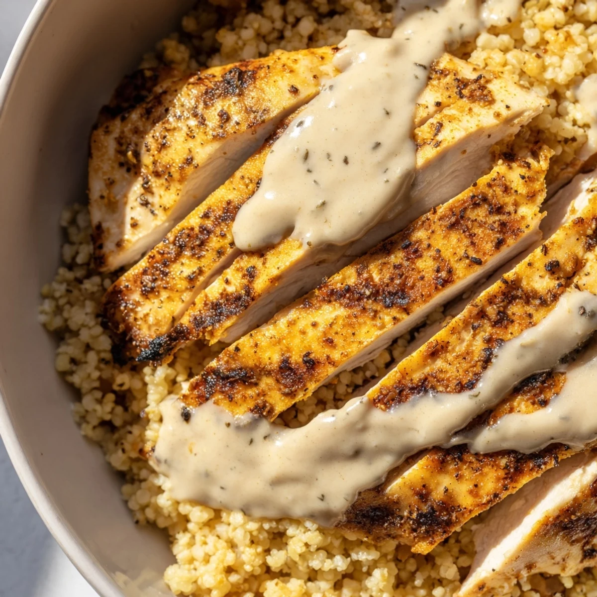 This vibrant bowl brings together tender chicken breasts marinated in aromatic Mediterranean spices like cumin, smoked paprika, and oregano. The chicken is grilled to golden perfection and sliced over light, fluffy couscous. Fresh cherry tomatoes, crisp cucumber, red onion, briny Kalamata olives, and baby greens add crunch and brightness. A creamy lemon-tahini drizzle ties everything together with its nutty, tangy flavor.
