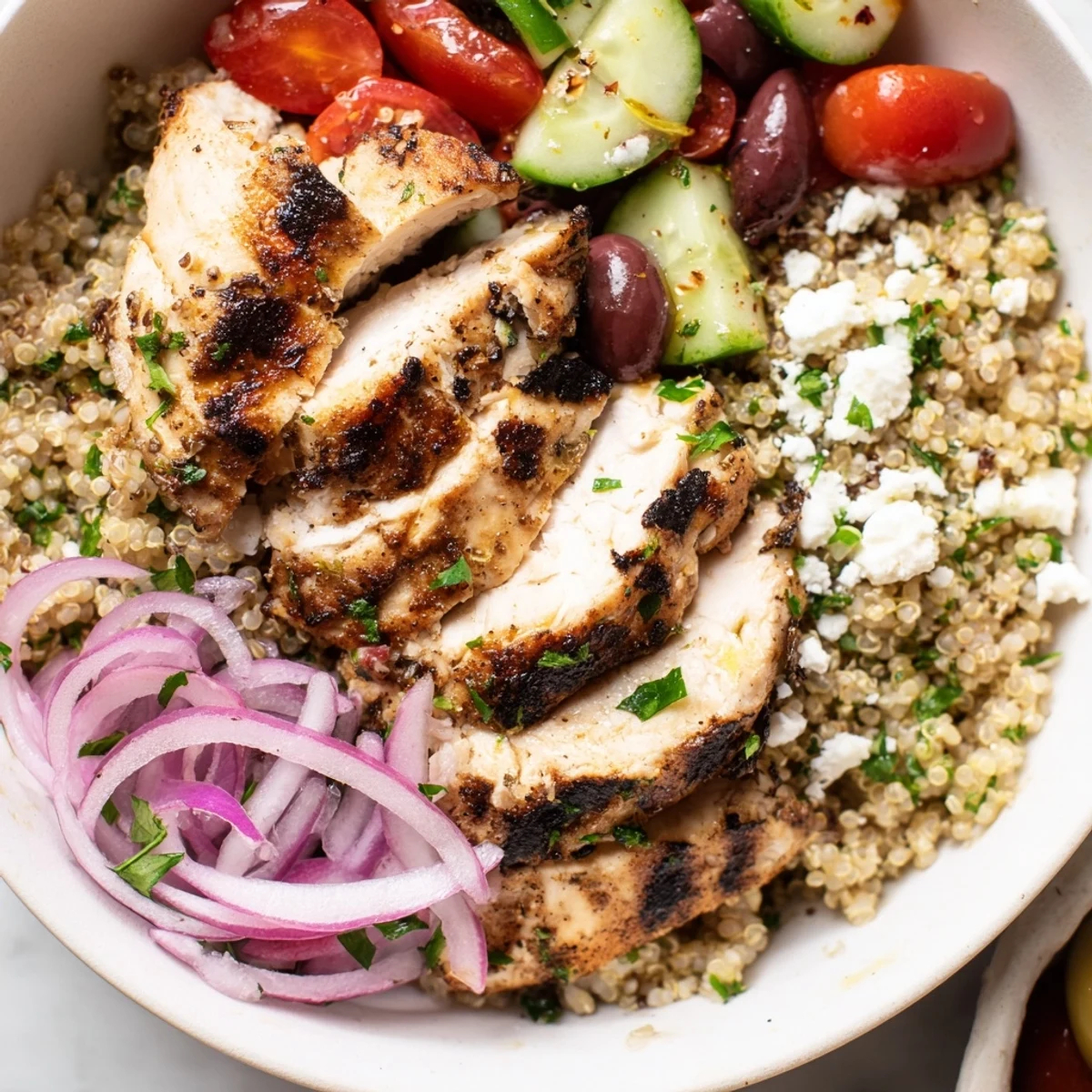 This Mediterranean-inspired bowl combines succulent grilled chicken seasoned with oregano, smoked paprika, and cumin over a bed of fluffy quinoa. Fresh cherry tomatoes, crisp cucumber, red onion, Kalamata olives, and tangy feta cheese add vibrant colors and bold flavors. A bright lemon-honey dressing ties everything together. Ready in just 45 minutes, this gluten-free, high-protein bowl works beautifully for meal prep or a satisfying weeknight dinner.