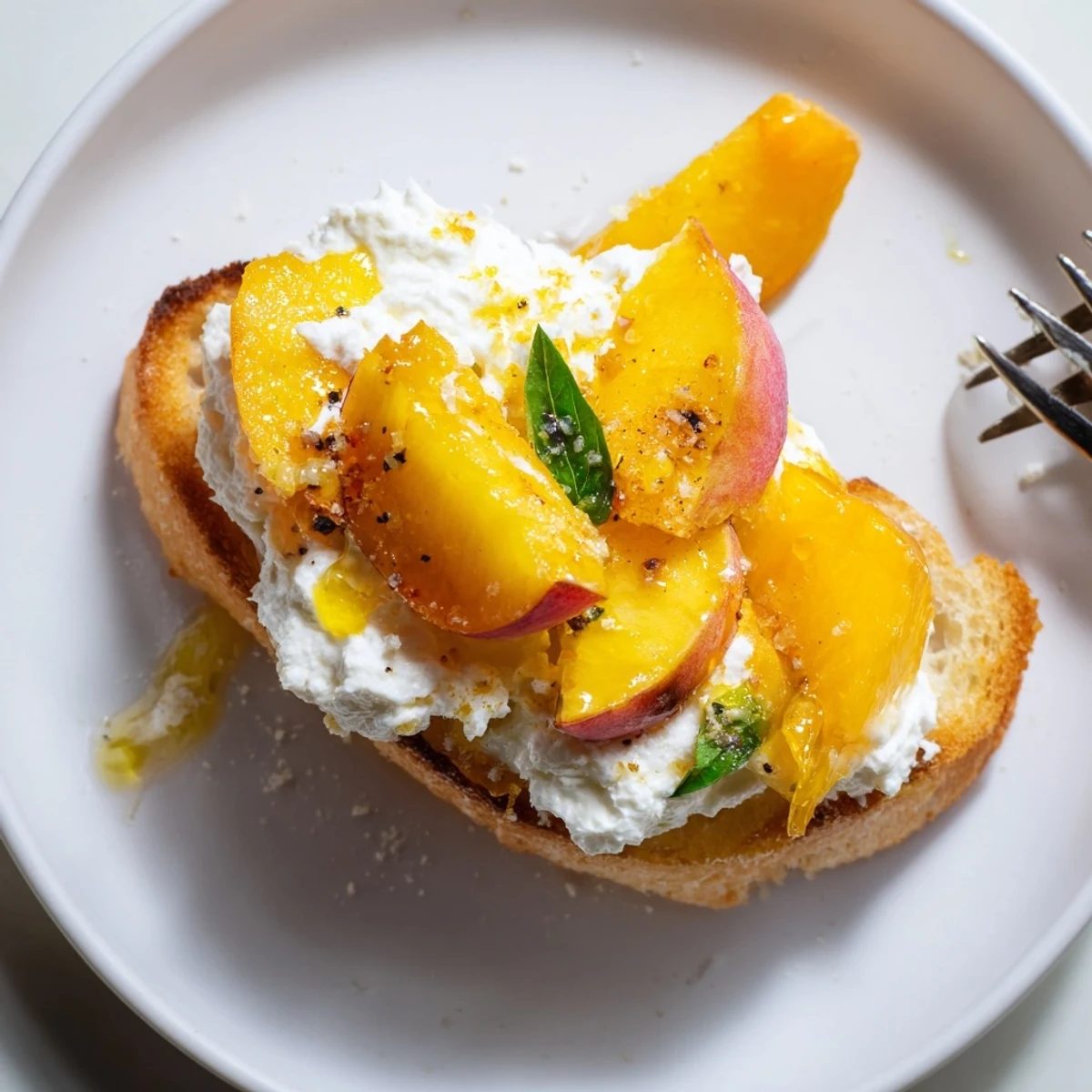 - Lay a few slices of peach on each ricotta-topped toast, pressing gently so they don't slip off.