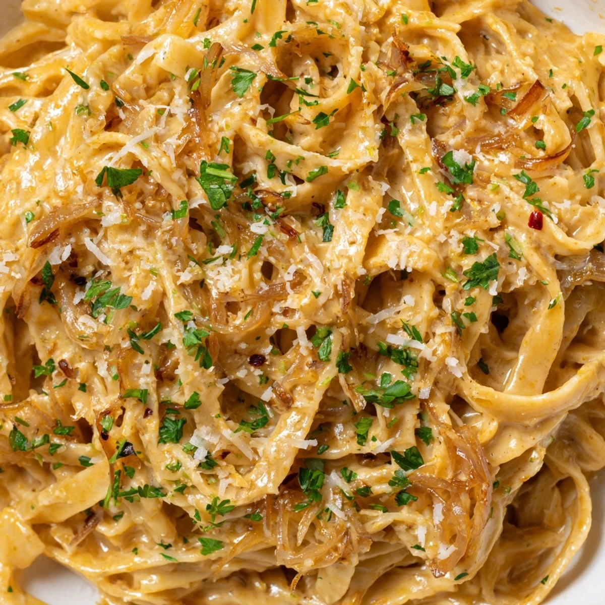 This creamy fettuccine dish brings together the rich sweetness of slowly caramelized onions with a gentle spicy kick. The onions are cooked down in olive oil and butter until golden and deeply flavorful, then enhanced with brown sugar for that perfect caramelized finish. A luxurious sauce of heavy cream, Parmesan, honey, and red chili creates the signature sweet heat balance that coats every strand of al dente pasta.